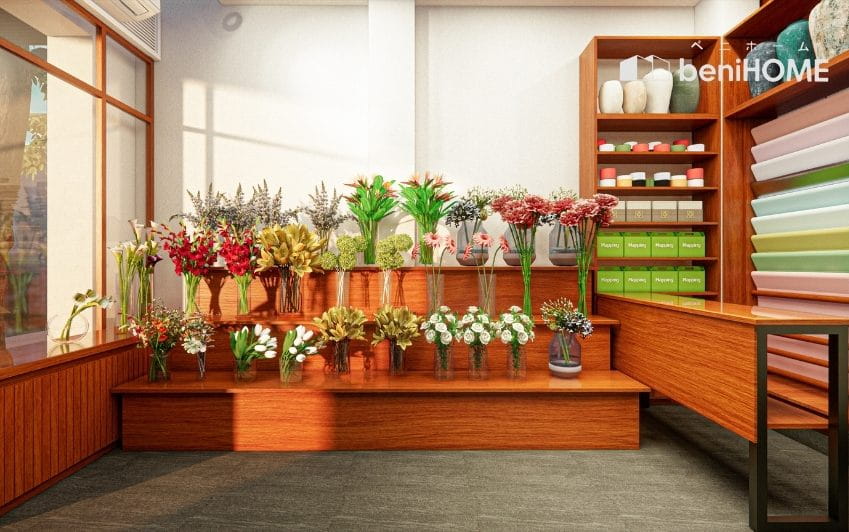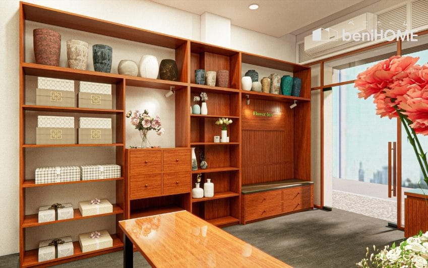 Toàn bộ nội thất trong cửa hàng được BeniHOME sử dụng gỗ công nghiệp cao cấp tông nâu đỏ ấm, với đường vân rõ nét tạo cảm giác sang trọng. Gỗ công nghiệp được ưu tiên thay vì gỗ tự nhiên nhờ khả năng chịu ẩm tốt – yếu tố quan trọng cho môi trường luôn tiếp xúc với nước và hoa tươi.