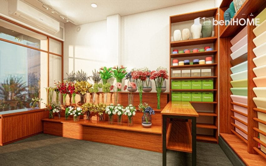 Thay vì dùng cửa gỗ đặc trưng của nội thất phong cách Nhật, BeniHOME lựa chọn cửa chính dạng Full Glass Facade nhằm phù hợp hơn với tính chất của một cửa hàng hoa hiện đại. Hệ cửa kính trong suốt mang lại lợi thế vượt trội khi giúp mặt tiền trở nên rộng thoáng, tối đa khả năng đón sáng tự nhiên và tạo hiệu ứng “mở” cho toàn bộ không gian.