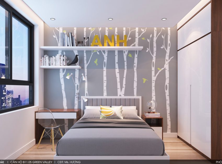 Phòng ngủ phụ được thiết kế với phong cách trẻ trung, sử dụng giấy dán tường họa tiết nhẹ nhàng để tạo điểm nhấn. Cách bố trí nội thất tập trung vào sự gọn gàng, giúp căn phòng dù diện tích vừa phải nhưng vẫn đáp ứng đầy đủ công năng cho sinh hoạt hằng ngày.