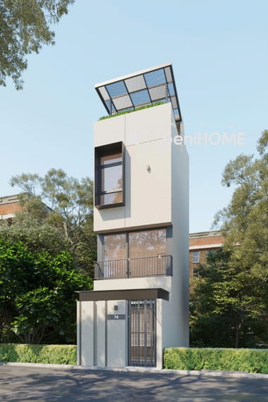 Công trình sở hữu mặt tiền khiêm tốn về chiều ngang nhưng được phát triển mạnh theo chiều cao. Giải pháp tạo hình khối hộp vuông vức, mạch lạc giúp tổng thể công trình trở nên gọn gàng, hiện đại và phù hợp với bối cảnh nhà phố đô thị.