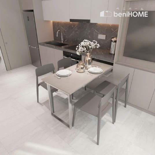 Bàn ăn tích hợp linh hoạt, có thể thu gọn hoặc mở rộng theo nhu cầu sử dụng.