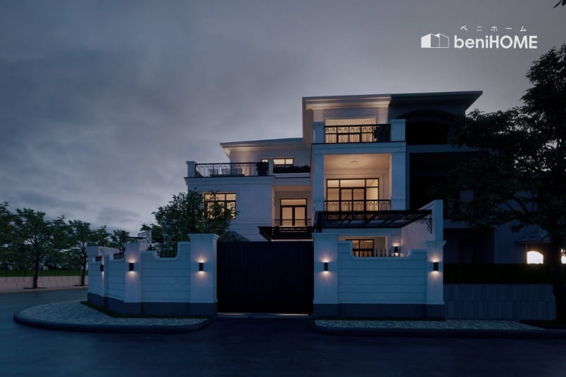 Hệ đèn tường (wall light) được bố trí hợp lý dọc tường rào và các trụ cột, tạo nên hiệu ứng ánh sáng sang trọng và lung linh cho công trình khi về đêm, đồng thời tăng tính an toàn trong quá trình sử dụng.