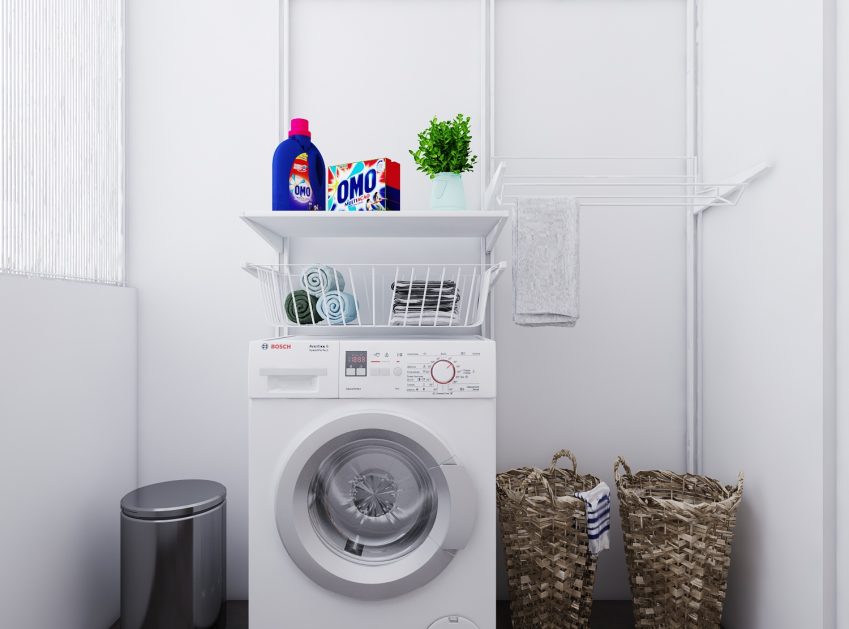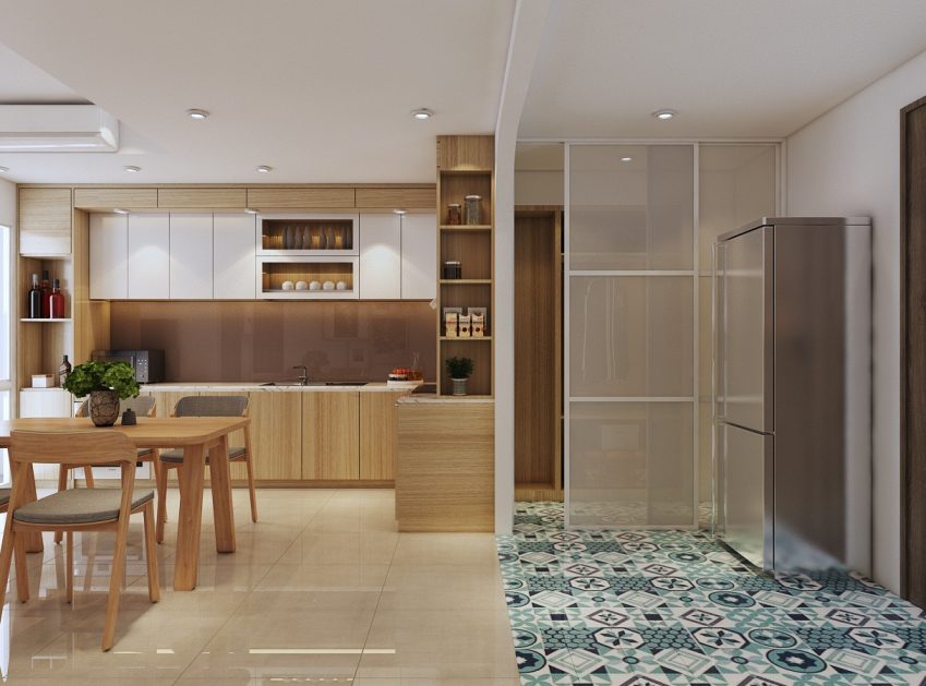 Khu vực sảnh vào được bố trí tủ giày kịch trần kết hợp gương đứng, giúp không gian luôn ngăn nắp và thuận tiện khi sử dụng. Sàn sảnh được lát gạch bông họa tiết tạo điểm nhấn nhẹ, đồng thời phân tách rõ ràng với khu vực sinh hoạt chung. Khu giặt được thiết kế nhỏ gọn nhưng đầy đủ công năng, tận dụng tối đa những góc không gian ít sử dụng trong căn hộ.