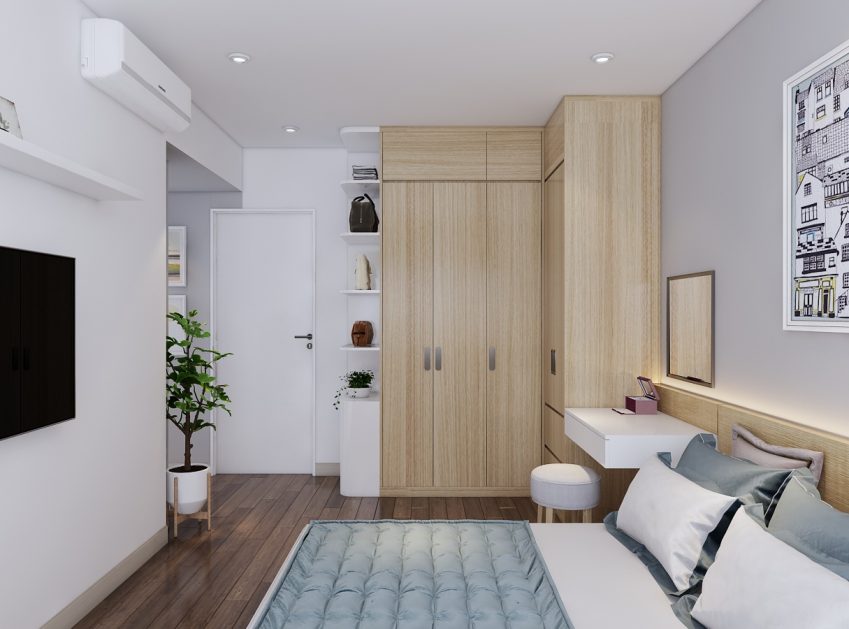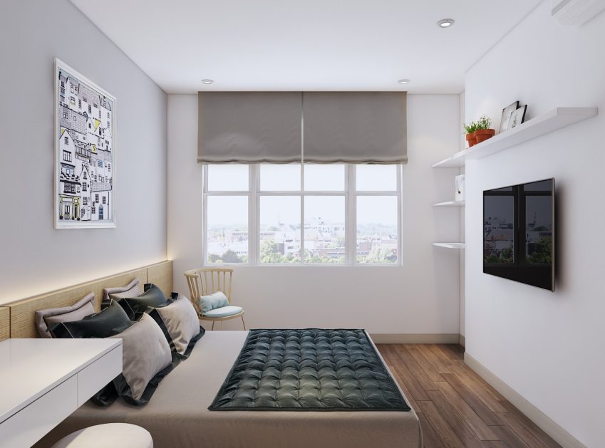 Không gian phòng ngủ chính được thiết kế theo hướng tối giản, ưu tiên cảm giác yên tĩnh và thư giãn. Hệ tủ quần áo kịch trần kết hợp bàn trang điểm treo giúp tối ưu công năng mà vẫn giữ được sự gọn gàng. Mảng đầu giường ốp gỗ tích hợp đèn LED hắt sáng tạo điểm nhấn nhẹ nhàng, đồng thời tăng chiều sâu cho không gian nghỉ ngơi. Cửa sổ lớn kết hợp rèm Roman giúp điều chỉnh ánh sáng linh hoạt theo từng thời điểm trong ngày.