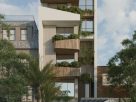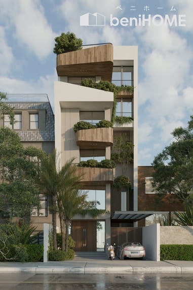 Các tầng được tổ chức theo dạng staggered layers – có lớp lùi, lớp nhô đan xen nhịp nhàng. Giải pháp này không chỉ tạo chiều sâu thị giác cho mặt tiền mà còn mở ra nhiều khoảng không gian ban công, giúp ngôi nhà như một thực thể đang “chuyển động” và vươn lên giữa đô thị.